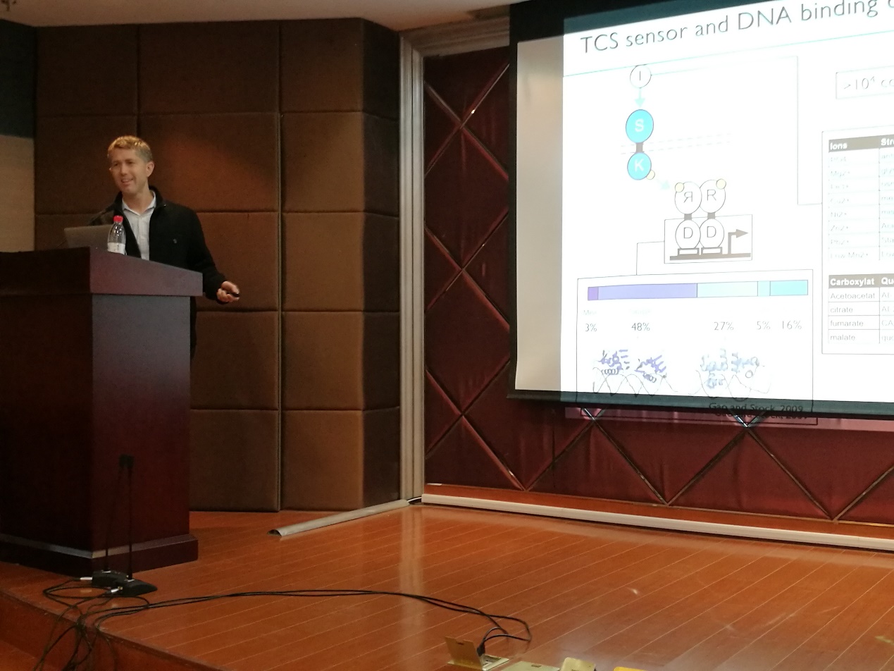 Tabor博士详细介绍了实验室合成生物学方向中针对双组份调控系统进行改造的最新研究成果。巧妙地将改造策略成功地应用在微生物主要的两大类双组份调控体系中,同时此策略也能使真核和原核生物中的双组份调控系统达到互换的效果。报告结束以后,与会师生就此双组份调控系统改造方法在合成生物学上的应用等方面与Tabor博士进行了深入交流。