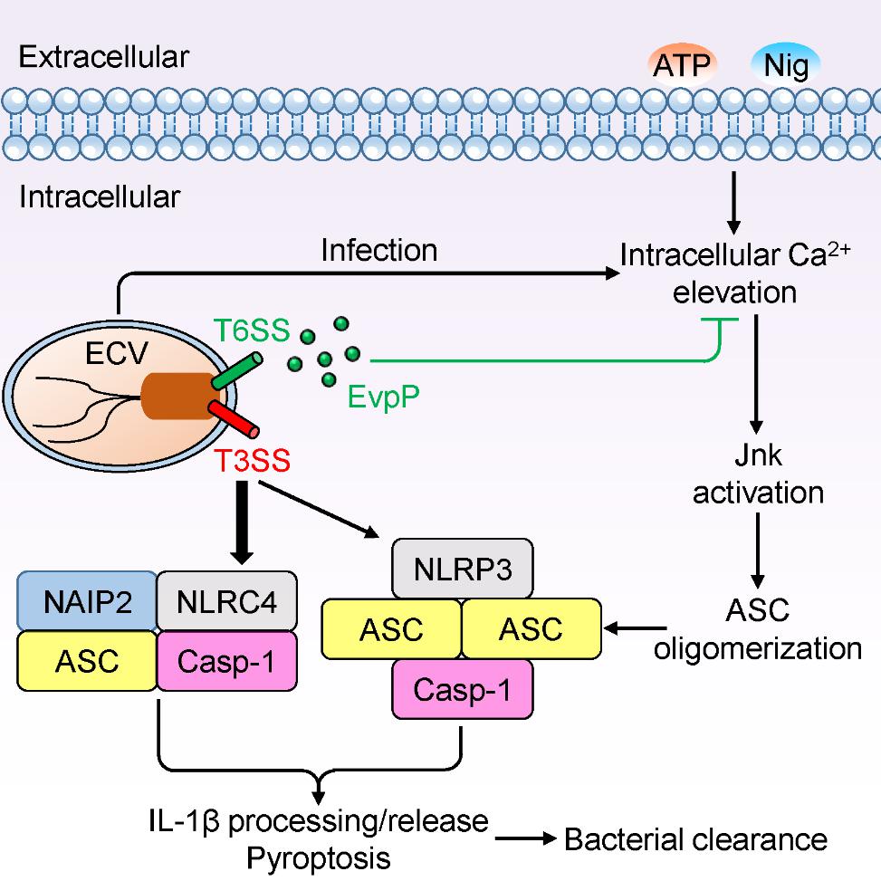 病原细菌与动物和人类宿主的相互作用是一个非常复杂的问题,涉及到病原细菌对宿主的感染和疾病发生,以及宿主对于病原的抑制和清除过程。动物体内固有免疫细胞的细胞质中存在着一种被称为NOD-like receptors (NLRs)的模式识别受体,当NLRs被病原微生物激活后,招募下游ASC接头蛋白和pro-caspase-1,组装成一个蛋白复合物,该蛋白复合物被称为炎症小体(Inflammasome)。在炎症小体内,pro-caspase-1得以活化,导致细胞发生焦亡以及下游促炎性细胞因子IL-1β和IL-18的成熟与分泌,进而清除病原微生物。