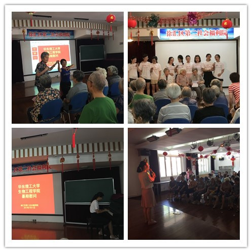 党支部志愿服务社会的活动,7月11日上午,学院院办教工党支部和联合二支部党员来到徐汇区第二社会福利院,为福利院老人们献上了一台主题为“情暖夕阳,关爱老年”的慰问演出,为他们晚年孤寂的精神世界献上一份关爱。