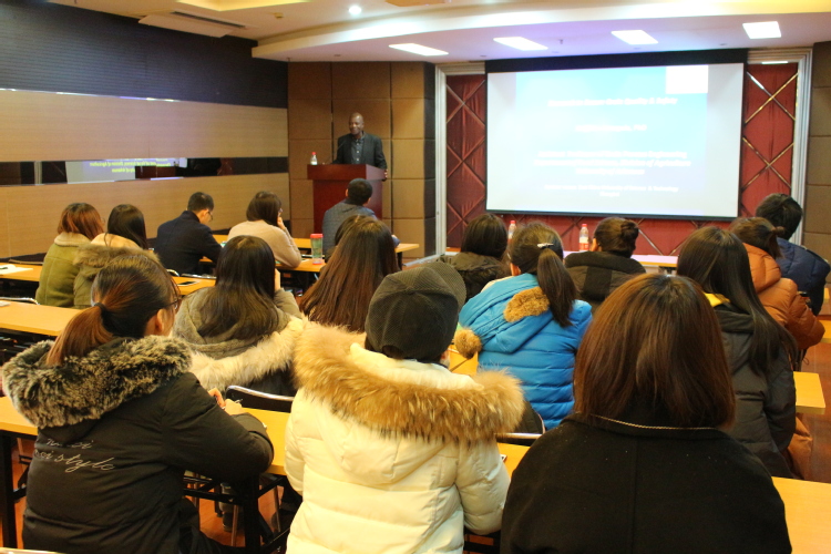 Atungulu博士首先详细介绍了阿肯色大学农业学部食品系的研究团队以及各个教授的研究方向,随后结合其研究室的最新研究进展,Atungulu博士重点介绍了粮食品质保持及真菌毒素产生控制策略。主要涉及了关键检测技术开发,有害粮食霉菌和毒素污染清除,粮食品质降低和有害霉菌生长/毒素产生动力学,粮食干燥/贮藏数学建模及优化。报告会上,Atungulu博士与到会师生进行了热烈地互动交流。
