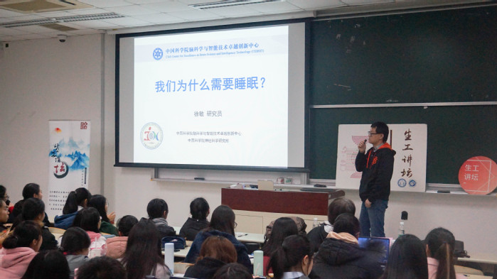 毕业学长、现任中国科学院上海生命科学研究神经科学研究所研究组组长的徐敏研究员做客102期生工讲坛,带领大家走进睡眠的奥秘。生工学院应用生物学系主任吴海珍教授与两百多名学生共同参与了活动。