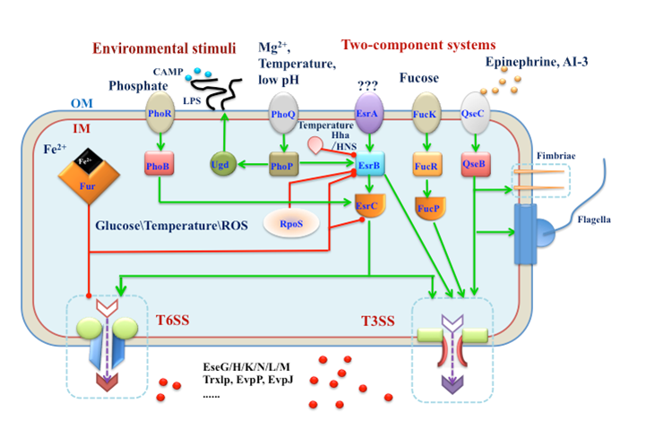 相关课题组紧扣“病原菌如何感知水产养殖环境和鱼类宿主生理变化并进行条件致病”主题,较为系统研究了相关病原菌感知包括温度、渗透压、pH、盐离子等鱼体内、外多种理化和生理信号变化并协调其中主要毒力系统T3SS和T6SS等表达和相关效应蛋白分泌的分子机制(图2),基本阐明造成鱼类病害发生的机理,并进行了减毒活疫苗的理性分子设计,相关研究成果发表在《iScience》、《Proceedings of the National Academy of Science of the United State of America》、《PLoS Pathogens》、《mBio》、《Environmental Microbiology》和《Virulence》等主流期刊,并获得多项国家发明专利授权和国家一类新兽药证书,相关疫苗产品也获得产业化应用,推动了我国海水养殖鱼类免疫防治体系的构建。