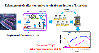 半胱氨酸是一种具有重要生理功能的含硫氨基酸,广泛用于医药、食品和日化领域。长期以来半胱氨酸采用比较原始的毛发水解工艺生产,导致效率低下,环境恶劣。课题组先期利用模块化策略和理性代谢工程实现了L-半胱氨酸在重组大肠杆菌中的有效积累,显著提高了L-半胱氨酸生产得率(Han Liu et al.Biotechnol J. 2018.)。后续针对硫源的有效利用进行深入工作。硫是细胞的重要组成元素,胞内许多涉及硫的反应会消耗大量能量,不易利用。该研究通过调节硫转录调节子cysB的表达方式、表达水平、表达时间来调节操纵子基因的表达,从而调节所有硫同化途径,最终显著提高硫源转化率。经过发酵工艺优化,重组菌能够合成7.5 g/L的半胱氨酸,硫源转化率高达90.11%。该研究为半胱氨酸的直接发酵生产奠定了基础。