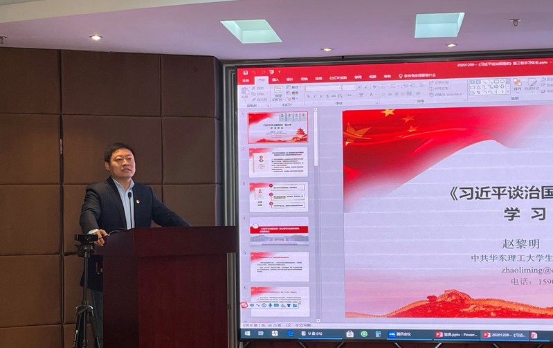 赵黎明结合十九届五中全会精神、自身学习体会和学院发展规划,以独到的见解、扎实的理论功底深刻阐述了《习近平谈治国理政》第三卷的出版背景和意义、主要内容、框架结构、学习重点、精神品格和科学方法,对系统全面领悟《习近平谈治国理政》第三卷的精神实质进行了详细解读,对深入学习贯彻习近平新时代中国特色社会主义思想进行了深刻阐释。他谈到,《习近平谈治国理政》第三卷是统揽伟大斗争、伟大工程、伟大事业、伟大梦想的创新之作,是着眼国际国内两个大局、谋划治党治国治军的精辟之作,是构建人类命运共同体和新型国际关系、引领全球治理体系改革完善提供中国方案的扛鼎之作,是用新思想武装全党、教育人民以及让世界了解中国的宝典之作,全体党员同志必须认真学习、深刻领会。