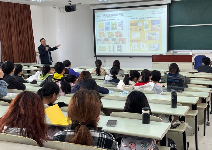 奉贤校区顺利举办。上海市食品学会常务副秘书长郭燕茹和施俏韵、光明乳业研究院研发主管贾宏信出席宣讲会并进行宣讲。生工学院教师刘卫兵、杜磊共同出席了本次活动。