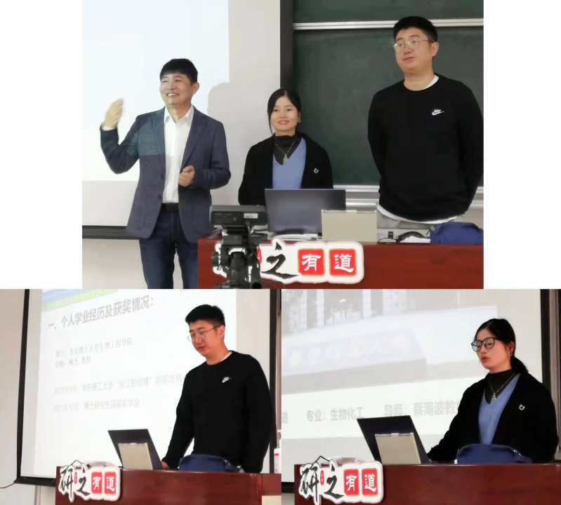 承办的两场“研之有道”系列分享沙龙在奉贤校区举行。本次活动邀请学院2021年度研究生国家奖学金获得者王进、蔡书善等优秀代表,分别就科研心得、文献阅读能力提升、科研生涯规划、双创及社会实践等方面同研究生们进行了分享和交流,现场气氛热烈。本次沙龙由学院研究生会学术部霍传富、罗智坤担任主持人,奉贤校区研究生辅导员张佼老师、兼职辅导员陈雨蒙老师出席,线上腾讯会议同步开放,共计100余人次参与此次系列活动。