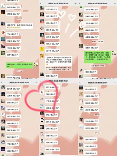 3月17日晚,生工学子积极踊跃报名参加,“确认守沪!”的信息在相关专业的学生微信群中接龙报名,超过100名的学生第一时间积极响应报名,最终,52名学生组成的华东理工大学第一批PCR检测志愿服务队迅速集结完毕。