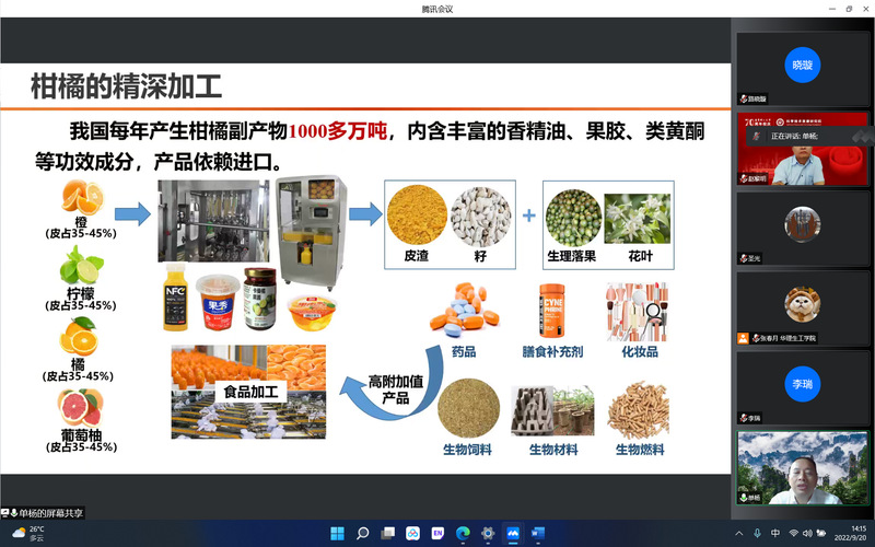 9月20日,应华东理工大学邀请,湖南省农业科学院院长单杨院士在线出席了华东理工大学70周年校庆报告活动暨第二十六期俊棠论坛。单杨院长作了题为“柑橘功能性成分的营养与健康”的学术报告,报告会由科学技术发展研究院院长赵黎明教授主持,生物反应器工程国家重点实验室主任张立新教授等近300名校内外师生在线聆听了报告。