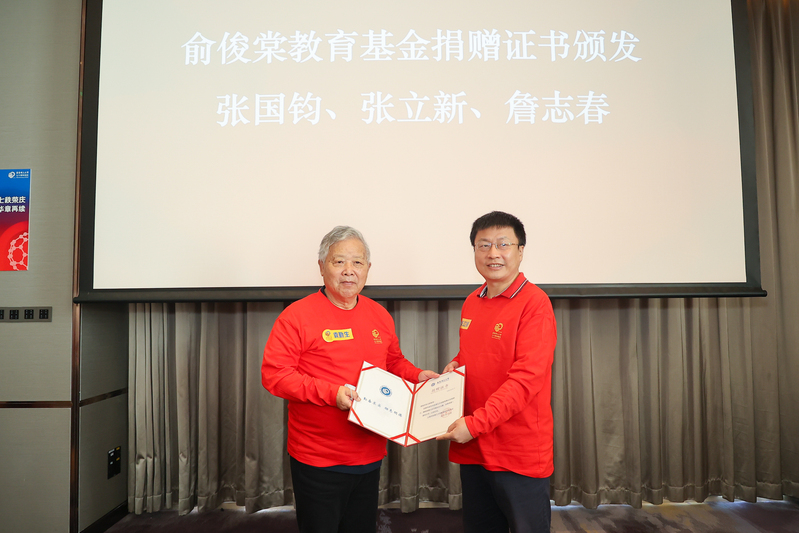 首任院长袁勤生先生向张立新等本年度俞俊棠教育基金发起人颁发捐赠证书,张立新等表示要以俞俊棠先生为榜样,以学科穿针、任务引线,建立交叉式学科发展体系,培养多层次、高素质人才。