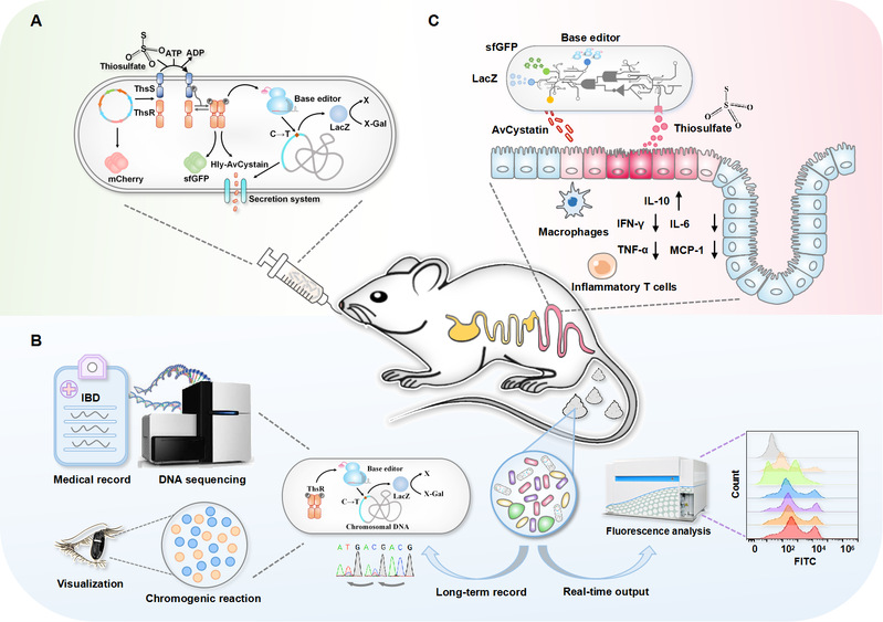 炎症性肠病(Inflammatory bowel disease, IBD) 包括Crohn’s disease (CD) 和Ulcerative colitis(UC),是胃肠道最常见的慢性炎症性疾病。我国IBD的发病率近几十年急剧增加,如不进行早期诊断和治疗,极易增加抑郁症、结直肠癌甚至死亡的风险。传统的诊断方式依赖于肠镜等侵入式的检测方法,对患者造成极大的痛苦,更重要的是难以实现早期诊断;并且传统的治疗手段难以控制精确的用药剂量,导致药物过量摄入的副作用,基于此作者开发了一株工程化智能益生菌i-ROBOT(intelligent Responsive Bacteria for Diagnosis and Therapy),该工程菌系统集成三个模块(荧光报告模块、碱基编辑记录模块和药物表达分泌模块),能够在体内同时执行诊断、记录和改善IBD的功能。i-ROBOT可以感知肠道疾病分子事件(例如炎症标志物硫代硫酸盐)的出现,通过产生即时荧光信号来反映当前的疾病状态,分子记录系统则将疾病信息转化为基因组 DNA 中的永久单核苷酸突变,进一步导致功能蛋白(例如显色酶LacZ)的翻译激活,通过DNA测序或肉眼可见的颜色反应读取炎症信息,该记录是长期可遗传的。此外,i-ROBOT拥有一套自调控的药物表达和分泌系统,可根据疾病标志物的水平释放相应浓度的治疗药物,无需服用额外的诱导物,该策略在有效改善疾病活性的同时不会引起用药过量的副作用,例如肠纤维化等。