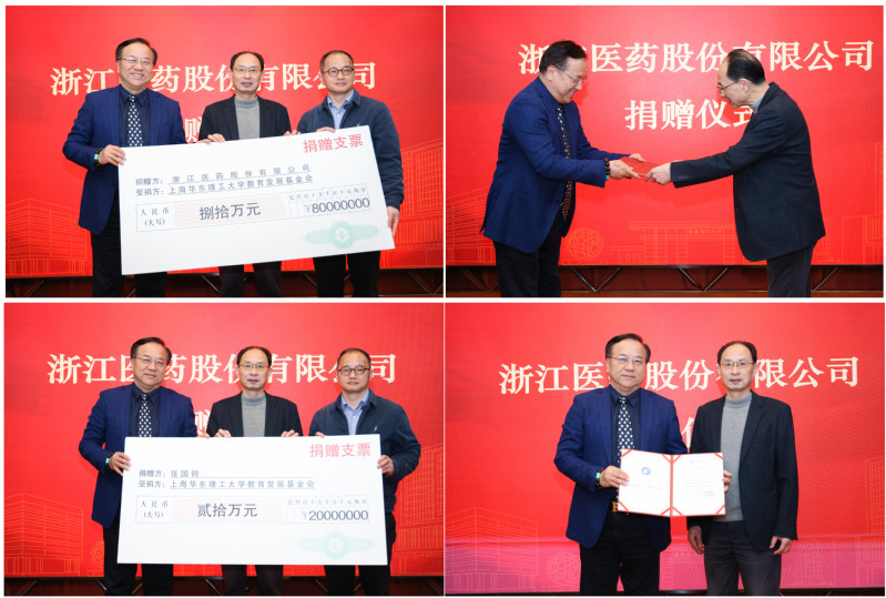 捐赠仪式上,在捐赠方嘉宾、学校和学院领导以及师生代表的共同见证下,李建伟、叶邦策代表受赠方接受了浙江医药股份有限公司和张国钧校友个人的捐赠,李建伟为浙江医药股份有限公司和张国钧校友分别颁发了捐赠证书。