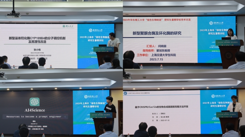 名誉院长杨胜利院士、上海交通大学洪亮教授、中国科学院分子植物科学卓越创新中心王勇教授、江南大学刘龙教授、上海锐康生物技术研发有限公司赵华博士、华东理工大学叶邦策教授、庄英萍教授、许建和教授、赵黎明教授、赵玉政教授十位国内知名专家,为大家做精彩的学术报告。报告涉及“数字合成生物学” “Natural Product Synthetic Biology:From Bacteria to Plant” “合成生物学产业发展与智能生物制造” “科学方法论与创新思维” “风口和机遇:合成生物产业的发展趋势”、“从ChatGPT到蛋白质工程通用大模型” “细胞代谢监测示踪与生命健康”“先进分离技术与生物制造”“脂肪酸的生物炼制”和“绿色生物制造让生活更美好”。这些报告引起了师生们浓厚的学术兴趣,现场气氛十分活跃。同学们纷纷表示,本次研究生暑期学校帮助他们实现了与领域专家近距离学术交流与探讨,促使他们更加了解最新的研究动态和学科前沿。