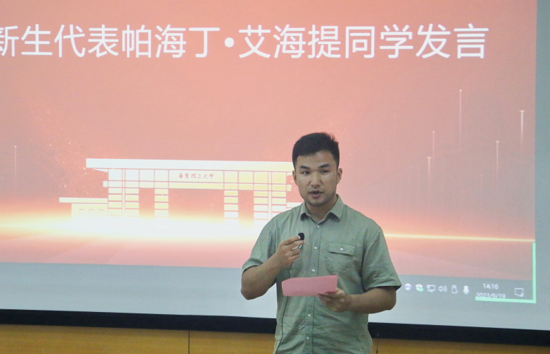 生物化工专业帕海丁•艾海提作为新生代表发言,讲述了自己在华理生工学院的成长和收获,并表达了生工学子志存高远、报效祖国的信心和决心。