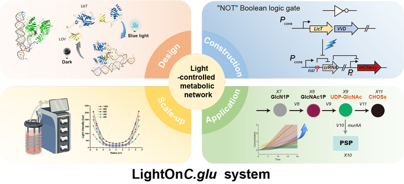 在合成生物学与代谢工程领域,构建微生物细胞工厂以高效生产化学品是主要目标之一,而实现微生物代谢网络中代谢流的最优分配是达成该目标的关键所在。谷氨酸棒杆菌作为生产氨基酸和高价值化学品的关键工业菌株,其生产效率的提升一直是科研关注的焦点。其中,平衡细胞生长和产品合成之间的代谢流是提高生产效率的关键环节。然而,长期以来,为谷氨酸棒杆菌开发动态、广泛适用且低毒性的基因调控工具面临巨大挑战,适用于动态调控策略的光遗传学工具此前一直处于空白状态。
