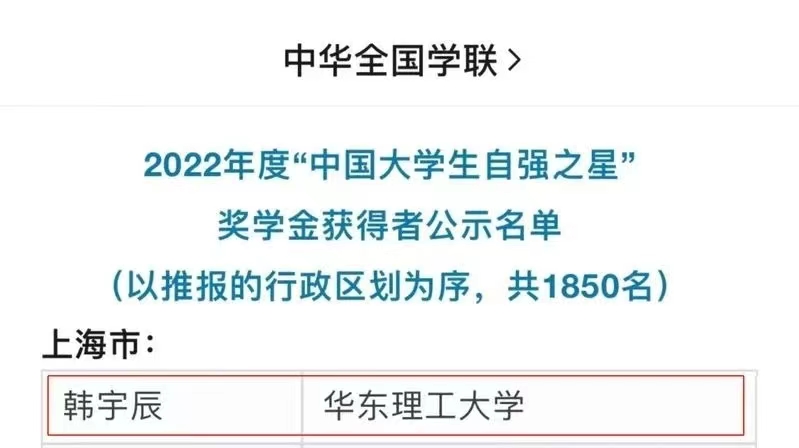 近日,由共青团中央、全国学联指导,中国青年报社、新东方教育科技集团、中国青年创业就业基金会联合举办的2022年度“中国大学生自强之星”奖学金获得者名单公示。经学校推荐、省级初评、全国评审等环节,动漫av 2022级硕士研究生韩宇辰入选,荣获“中国大学生自强之星”奖学金。